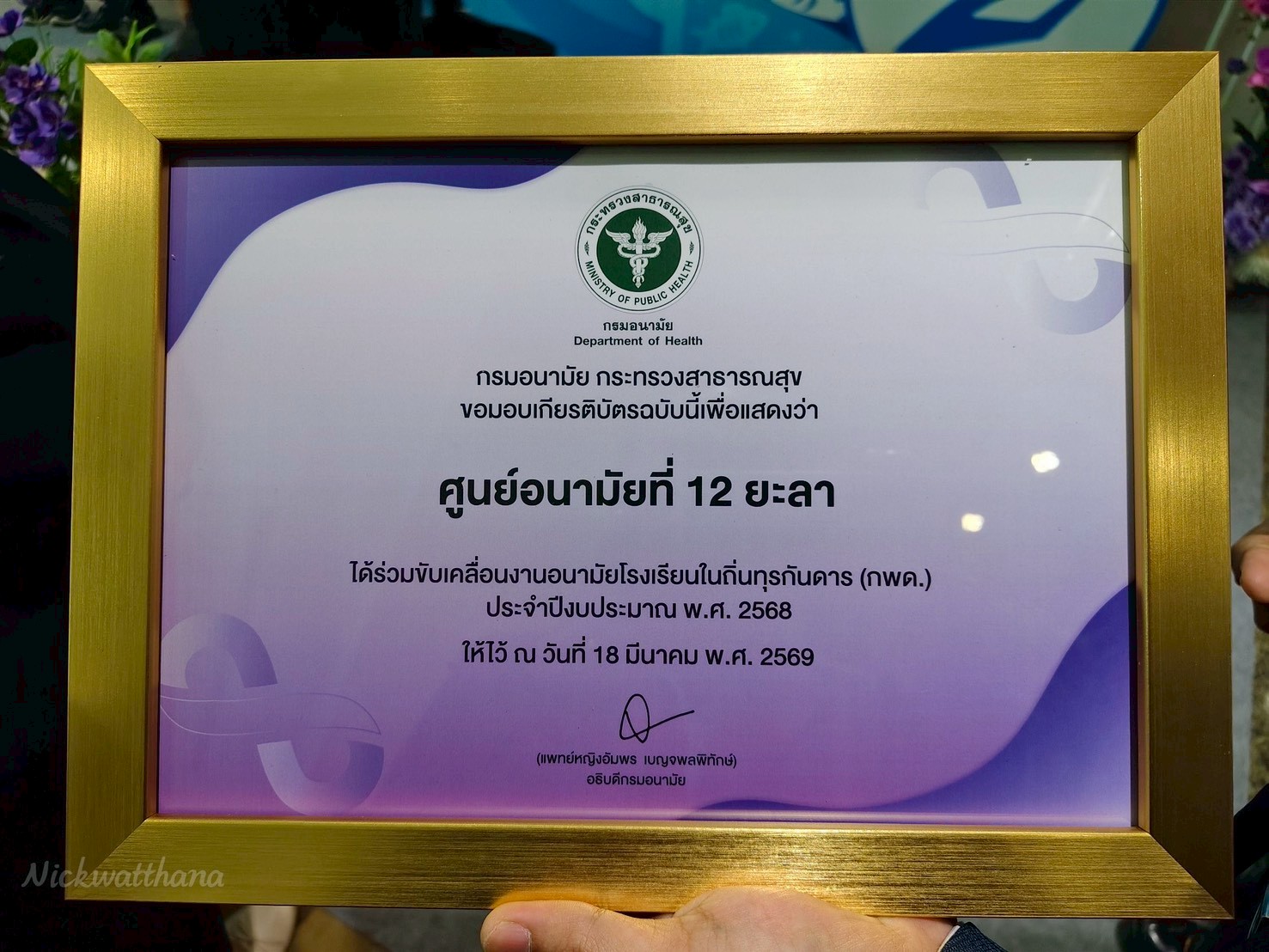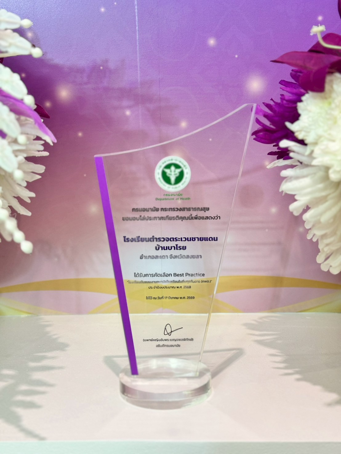 วันที่ 17 มีนาคม 2569 ศูนย์อนามัยที่ 12 ยะลา ขอแสดงความยินดีกับโรงเรียนตำรวจตระเวนชายแดนบ้านบาโรย อ.สะเดา จ.สงขลา ได้รับโล่ประกาศเกียรติคุณ โรงเรียนต้นแบบงานอนามัยโรงเรียนในถิ่นทุรกันดาร (กพด.) และ ศูนย์อนามัยที่12 ยะลา ได้รับเกียรติบัตรเชิดชูเกียรติ ร่วมขับเคลื่อนการดำเนินงานอนามัยโรงเรียนในถิ่นทุรกันดาร (กพด.) ประจำปีงบประมาณ พ.ศ. 2568 โดยได้รับเกียรติจากแพทย์หญิงอัมพร เบญจพลพิทักษ์ อธิบดีกรมอนามัย เป็นประธานในพิธีมอบโล่ประกาศเกียรติคุณ โรงเรียนต้นแบบงานอนามัยโรงเรียนในถินทุรกันดาร (กพด.) พร้อมด้วย แพทย์หญิงนงนุช ภัทรอนันตนพ รองอธิบดีกรมอนามัย นายแพทย์ปกรณ์ ตุงคะเสรีรักษ์ รองอธิบดีกรมอนามัย ในงานประชุมวิชาการส่งเสริมสุขภาพและอนามัยสิ่งแวดล้อมแห่งชาติ ครั้งที่ 18 (Building Sustainable Wellness under Climate Change)