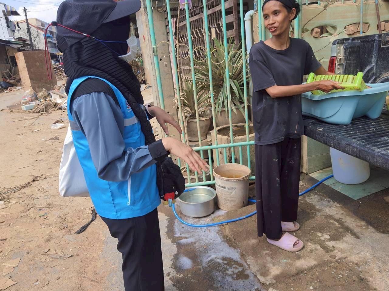 วันที่ 2 ธันวาคม 2568 ทีม SEhRT ศูนย์อนามัยที่ 12 ยะลา ร่วม ทีม SEhRT ศูนย์อนามัยที่ 4 สระบุรี ลงพื้นที่เยี่ยมและประเมินสถานการณ์การณ์ด้านสุขอนามัย ณ ชุมชนสามททหาร ชุมชนบางหัก ชุมชนเกาะเลียบ และชุมชนรัตนอุทิศ เทศบาลนครหาดใหญ่ ในพื้นที่น้ำประปาไหล ผลตรวจไม่พบคลอรีน พบขยะในชุมชน ทีม SEhRT ได้ให้คำแนะนำด้านการจัดการขยะ โรยปูนขาวดับกลิ่น และการล้างมือ นอกจากนี้ได้มอบ ชุด V-clean, ยาน้ำกัดเท้า, ชุดยาสามัญ, ผ้าอ้อมเด็ก, ยาป้องกันโรคฉี่หนู, หนังสือนิทาน, คลอรีนเม็ด เพื่อสนับสนุนการดูแลผู้ประสบภัย