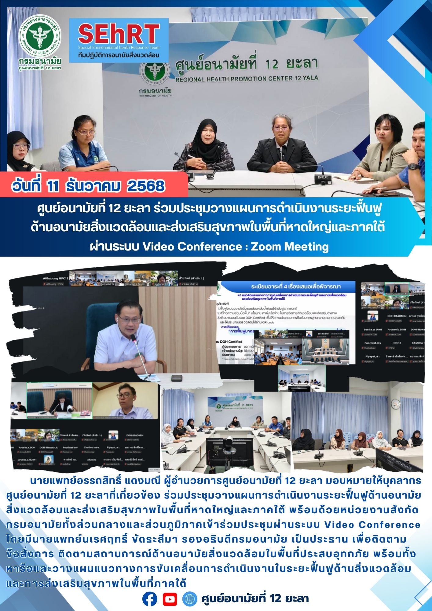วันที่ 11 ธันวาคม 2568 นายแพทย์อรรถสิทธิ์ แดงมณี ผู้อำนวยการศูนย์อนามัยที่ 12 ยะลา มอบหมายให้บุคลากรศูนย์อนามัยที่ 12 ยะลาที่เกี่ยวข้อง ร่วมประชุมวางแผนการดำเนินงานระยะฟื้นฟูด้านอนามัยสิ่งแวดล้อมและส่งเสริมสุขภาพในพื้นที่หาดใหญ่และภาคใต้ พร้อมด้วยหน่วยงานสังกัดกรมอนามัยทั้งส่วนกลางและส่วนภูมิภาคเข้าร่วมประชุมผ่านระบบ Video Conference โดยมีนายแพทย์นเรศฤทธิ์ ขัดธะสีมา รองอธิบดีกรมอนามัย เป็นประธาน เพื่อติดตาม ข้อสั่งการ ติดตามสถานการณ์ด้านอนามัยสิ่งแวดล้อมในพื้นที่ประสบอุทกภัย พร้อมทั้งหารือและวางแผนแนวทางการขับเคลื่อนการดำเนินงานในระยะฟื้นฟูด้านสิ่งแวดล้อมและการส่งเสริมสุขภาพในพื้นที่ภาคใต้