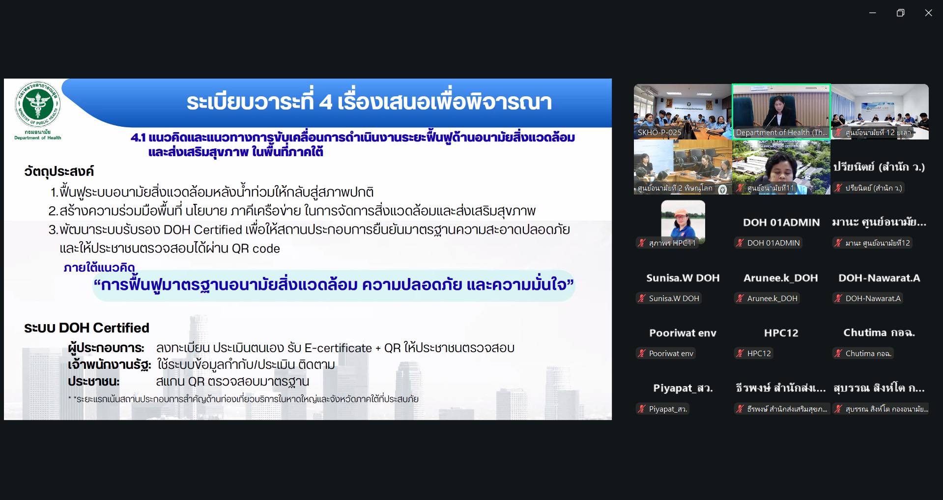 วันที่ 11 ธันวาคม 2568 นายแพทย์กฤษฎา ศิริชัยสิทธิ์ ผู้อำนวยการศูนย์อนามัยที่ 8 อุดรธานี นายมานะ หะสาเมาะ รองผู้อำนวยการศูนย์อนามัยที่ 12 ยะลา สายวิชาการด้านอนามัยสิ่งแวดล้อม นำทีม SEhRT กรมอนามัย ร่วมประชุมการดำเนินงานระยะฟื้นฟูด้านอนามัยสิ่งแวดล้อมและส่งเสริมสุขภาพในพื้นที่หาดใหญ่และภาคใต้ ผ่านระบบ Video Conference ณ ห้องประชุมลีลาวดี ชั้น 2 สำนักสาธารณสุขจังหวัดสงขลา โดยมี นายแพทย์นเรศฤทธิ์ ขัดธะสีมา รองอธิบดีกรมอนามัย เป็นประธานในการประชุม เพื่อติดตาม ข้อสั่งการ ติดตามสถานการณ์ด้านอนามัยสิ่งแวดล้อมในพื้นที่ประสบอุทกภัย พร้อมทั้งหารือและวางแผนแนวทางการขับเคลื่อนการดำเนินงานในระยะฟื้นฟูด้านสิ่งแวดล้อมและการส่งเสริมสุขภาพในพื้นที่ภาคใต้