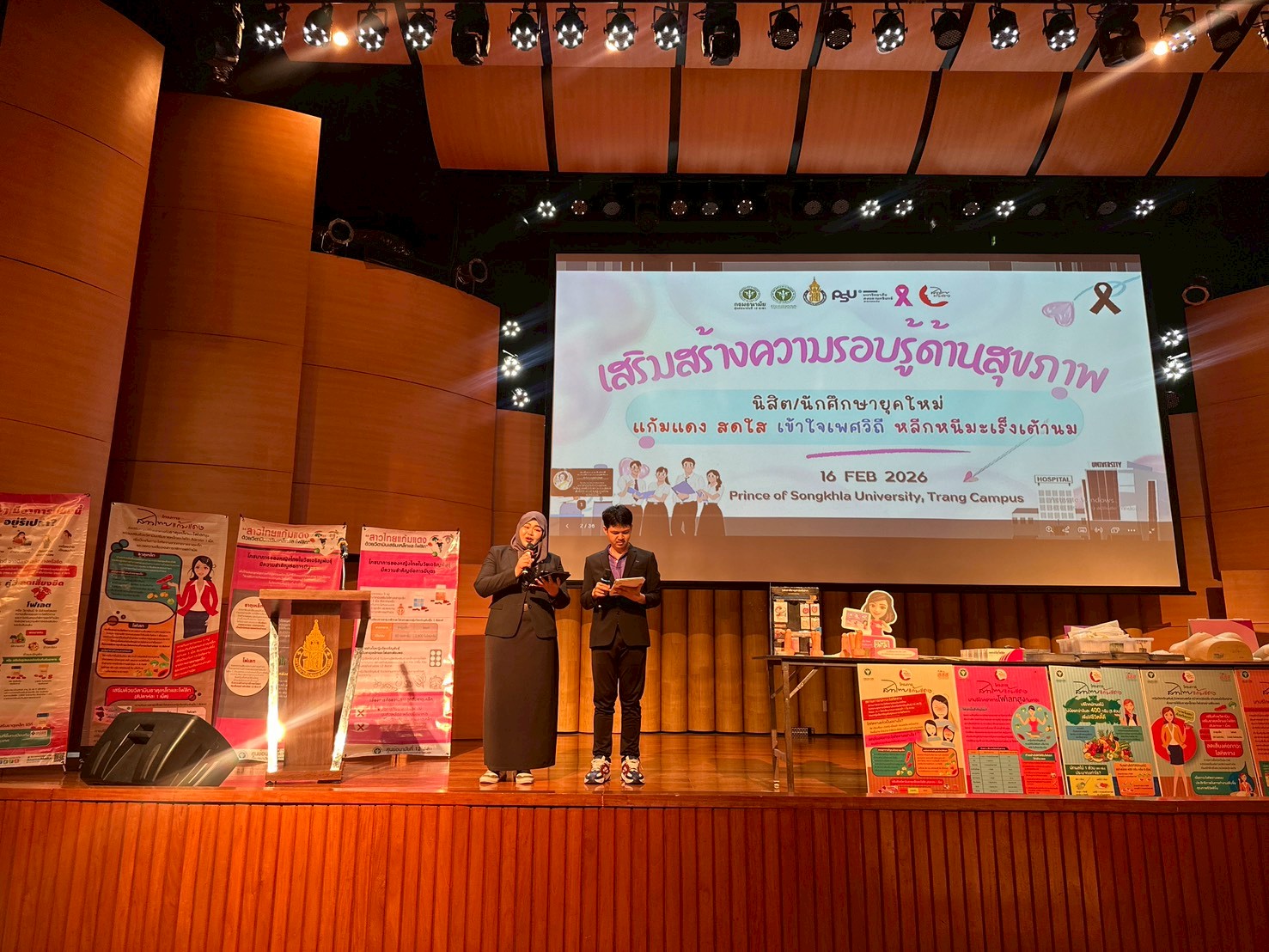 วันที่ 13-16 กุมภาพันธุ์ 2569 ศูนย์อนามัยที่ 12 ยะลา โดยกลุ่มพัฒนาการส่งเสริมสุขภาพวัยทำงาน กลุ่มพัฒนาการส่งเสริมสุขภาพวัยเรียนวัยรุ่น สำนักงานสาธารณสุขจังหวัดสตูล เเละสำนักงานสาธารณสุขจังหวัดตรัง ลงพื้นที่จัดกิจกรรมรณรงค์สร้างความรอบรู้ด้านสุขภาพ ณ วิทยาลัยเทคนิคสตูล อำเภอเมืองสตูล จังหวัดสตูล เเละมหาวิทยาลัยสงขลานครินทร์ วิทยาเขตตรัง อำเภอเมืองตรัง จังหวัดตรัง ภายใต้แคมเปญ "นิสิต/นักศึกษายุคใหม่ แก้มแดง สดใส เข้าใจเพศวิถี หลีกหนีมะเร็งเต้านม" โดยกิจกรรมครั้งนี้เน้นการให้ความรู้เกี่ยวกับโรคมะเร็งเต้านม การสาธิตวิธีตรวจเต้านมด้วยตนเอง (BSE) เพื่อการค้นพบความผิดปกติตั้งแต่ระยะเริ่มต้น การแนะนำแอปพลิเคชัน BSE App สำหรับบันทึกผลการคัดกรอง การส่งเสริมการรับประทานอาหารที่มีธาตุเหล็กและโฟเลตเพื่อป้องกันภาวะโลหิตจาง และการเสริมสร้างทักษะชีวิตด้านเพศวิถีอย่างเหมาะสม โดยมีคณาจารย์และนักศึกษาที่สนใจเข้าร่วมรวมทั้งสิ้น 120 คน
