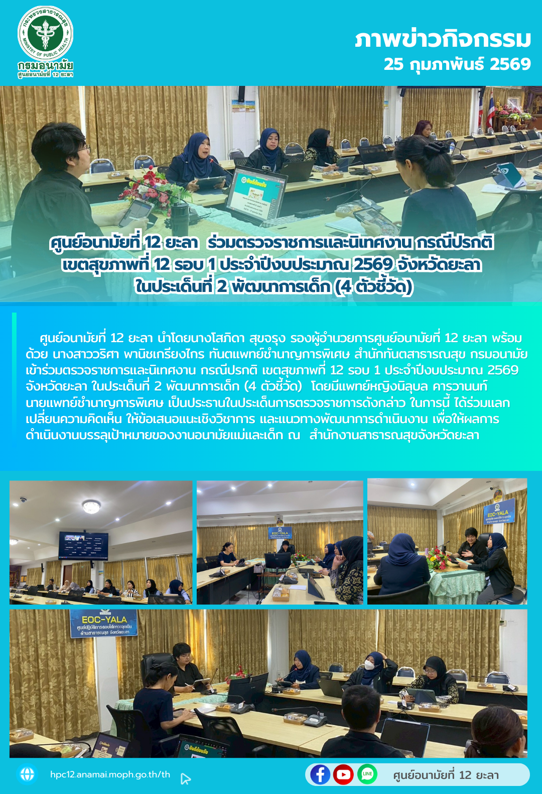 วันที่ 25 กุมภาพันธ์ 2569 ศูนย์อนามัยที่ 12 ยะลา นำโดยนางโสภิดา สุขจรุง รองผู้อำนวยการศูนย์อนามัยที่ 12 ยะลา พร้อมด้วย นางสาววริศา พานิชเกรียงไกร ทันตแพทย์ชำนาญการพิเศษ สำนักทันตสาธารณสุข กรมอนามัย เข้าร่วมตรวจราชการและนิเทศงาน กรณีปรกติ เขตสุขภาพที่ 12 รอบ 1 ประจำปีงบประมาณ 2569 จังหวัดยะลา ในประเด็นที่ 2 พัฒนาการเด็ก (4 ตัวชี้วัด)
